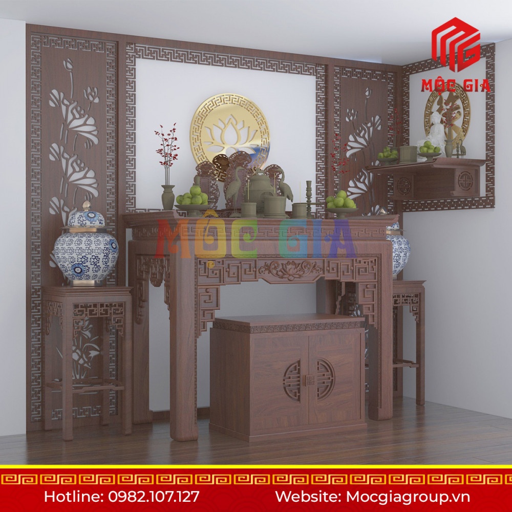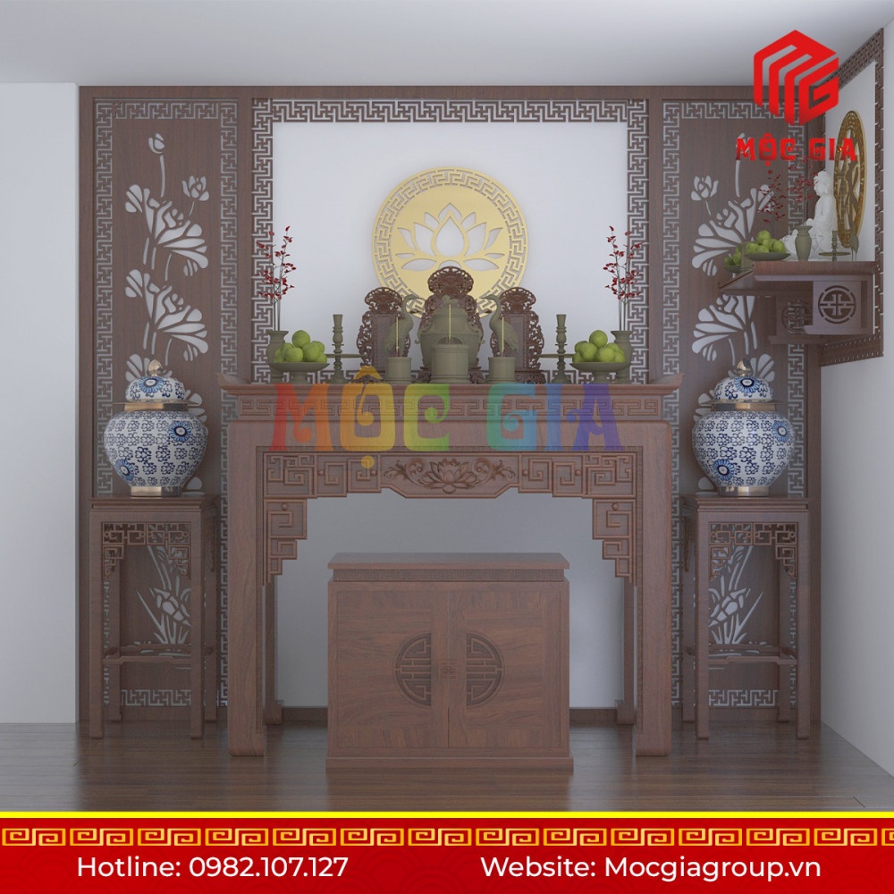 Thiết kế vách ngăn, ốp CNC tạo không gian thờ riêng biệt vừa là điểm nhấn cho ngôi nhà bằng những họa tiết truyền thống, vừa tạo cho không gian thờ yên tĩnh, tránh làm bởi những tác động bên ngoài.Chất liệu làm bàn thờ là 100% gỗ tự nhiên như: Gỗ hương đá, Gỗ hương đỏ, Gỗ gõ đỏ, Gỗ gụ, Gỗ mít, Gỗ sồi … Tất cả các sản phẩm bàn thờ của Mộc Gia đã được qua tẩm sấy chống mối, mọt, chống cong vênh …
